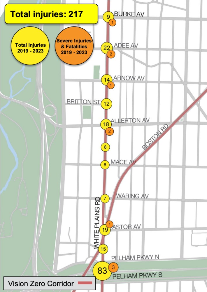 White Plains Road is one of the most dangerous streets in the Bronx, with a rate of 5.4 pedestrians killed or seriously injured per mile between 2017 and 2021, according to DOT data. The road is a DOT Vision Zero priority corridor.