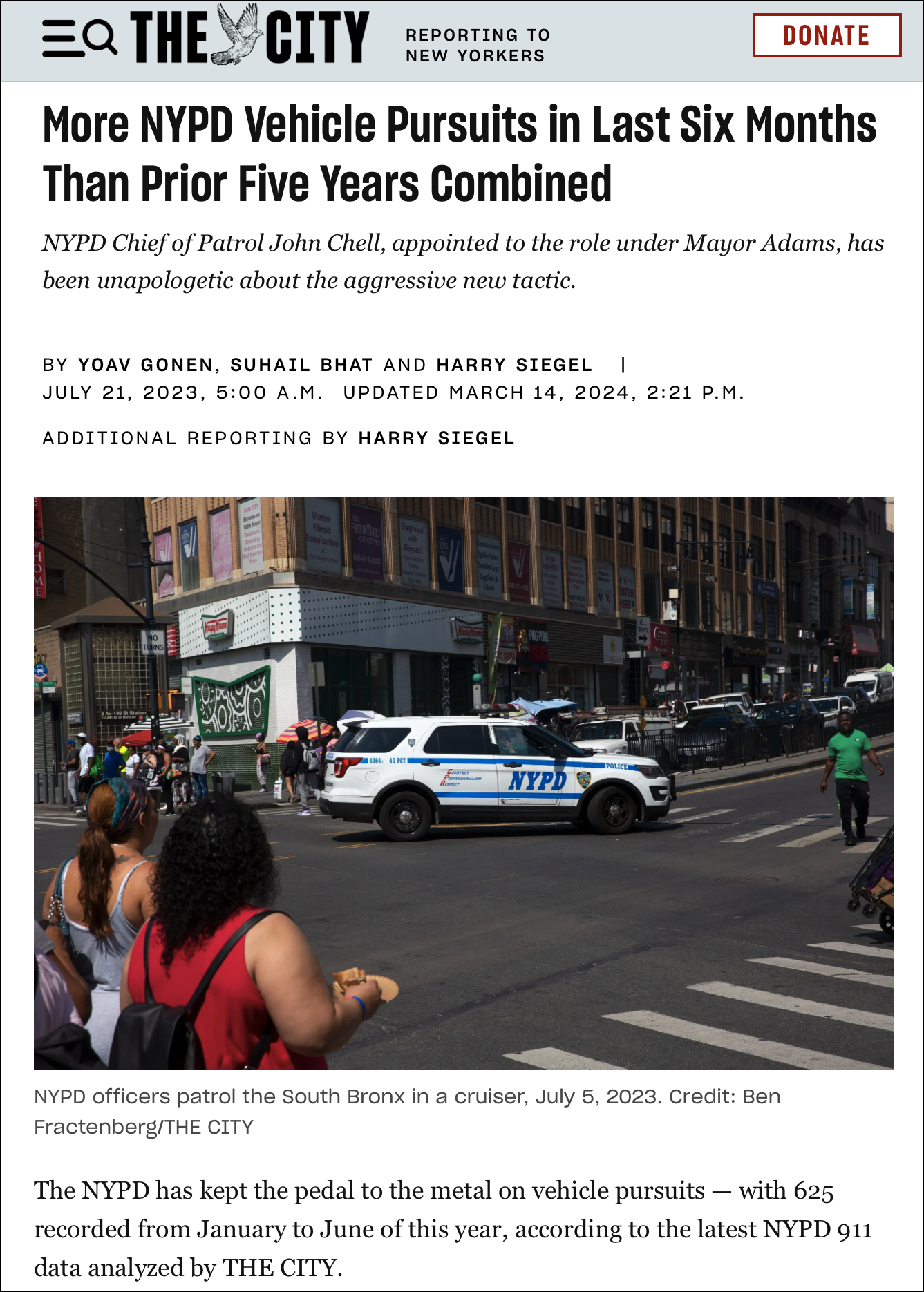 Last July, The City documented the NYPD’s increase in reliance on chases, but has not updated the number since. But they show a continued trend towards more police chase: