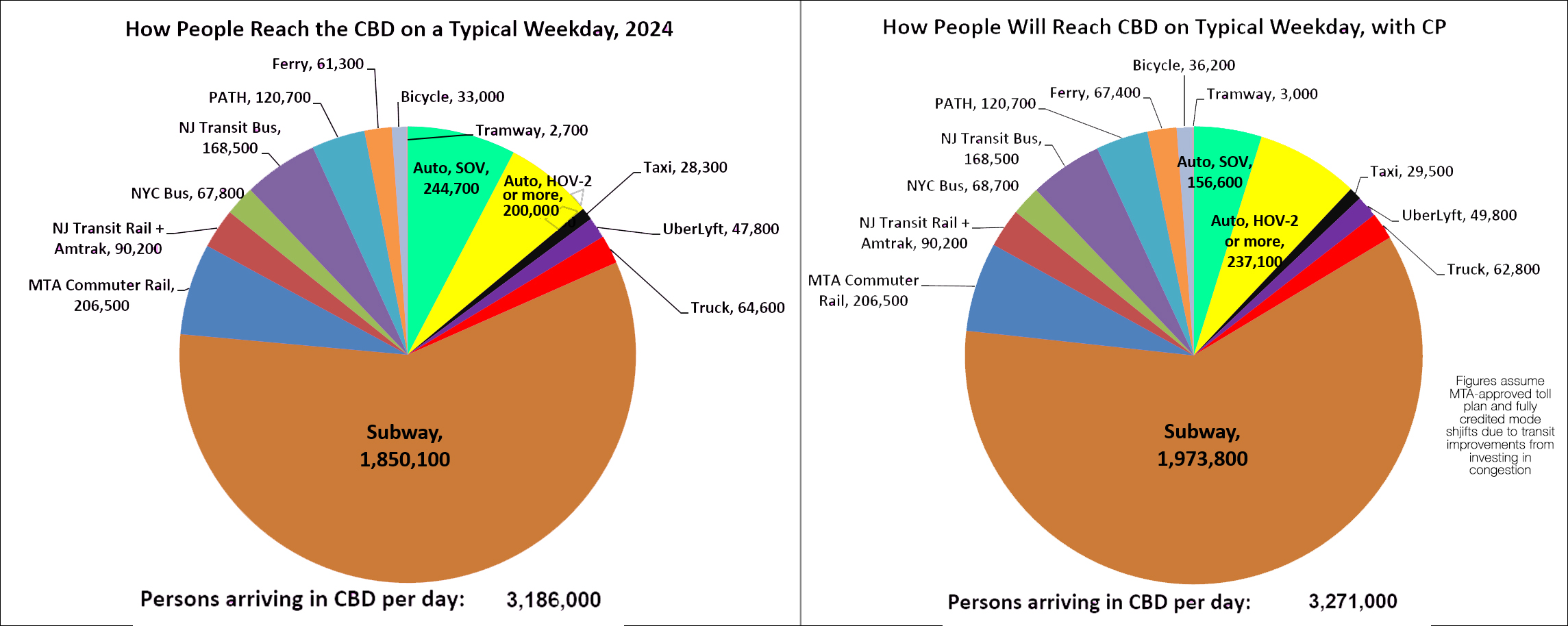 Even if you completely discount my modest upward bump in carpooling — and that’s quite a negation — congestion pricing still yields a 45,000 net increase in the number of people coming to (not through) the CBD on an average day.