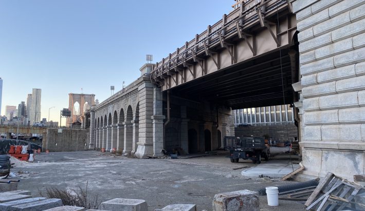 The spaces sandwich the bridge’s Brooklyn end between Washington Street and Old Fulton Street, known as Anchorage Plaza, and once hosted art exhibits back in the 1980s, before morphing into a public parking lot and eventually a closed city storage area in the 2000s.