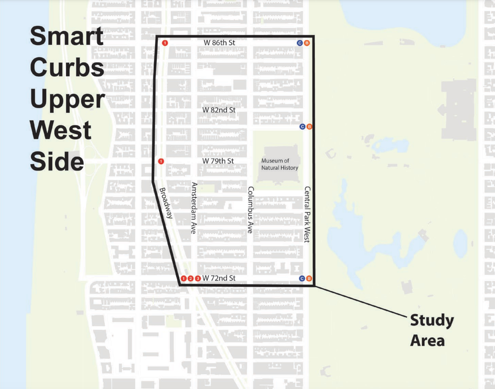 The DOT pilot covers the area bounded by W. 72nd and W. 86th streets, and Central Park West and Broadway, and looks at ways to use the curb for a wider benefit than just letting people park their private vehicles there — in a part of the city where nearly three-quarters of households don’t have a car.