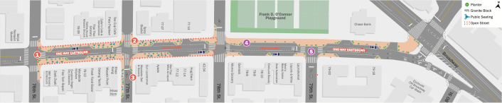 The agency’s initial design for the epicenter of the Thai community calls for Woodside Avenue between 76th Street and Broadway in Elmhurst to become one lane, eastbound-only stretch, with the space repurposed for seating plazas and restaurant tables that currently only serve customers during weekend open street hours.