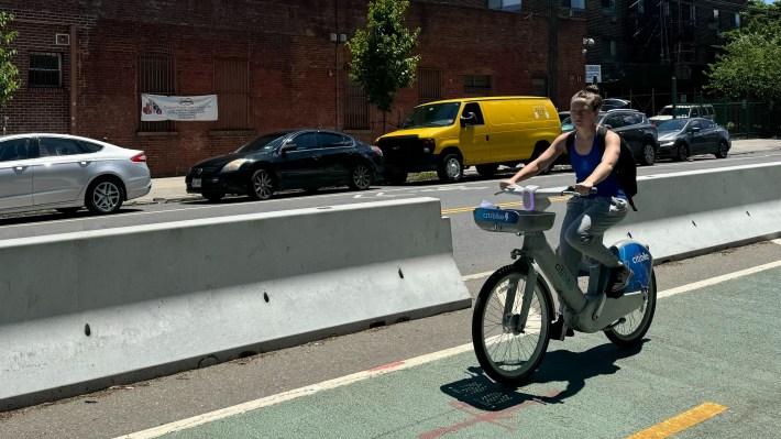 The two-way protected bike lane along Vernon Boulevard by the Queens waterfront received extra concrete and plastic protection this spring between 33rd Road and 35th Avenue.