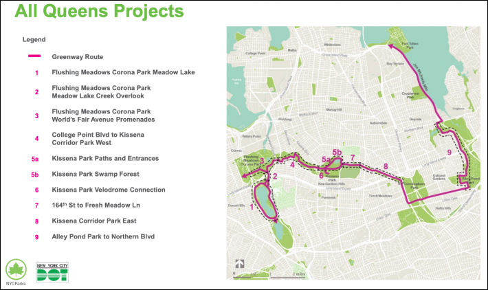 The projects still without funding are a greenway loop around Meadow Lake (1), a new route along the World’s Fair Avenue promenades (3), and a new connection Alley Pond Park to Northern Boulevard (9).