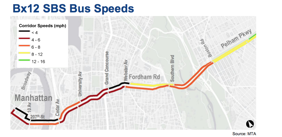 The DOT’s failure on Fordham Road defies the roadway’s history as one of the city’s early 21st century bus success stories: When the curbside lane was installed — and the Bx12 turned into the first Select Bus Service line — in 2008, bus speeds jumped as high as 9 miles per hour and ridership went up by 15 percent.
