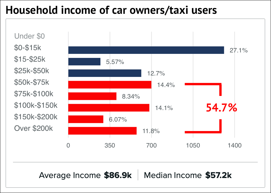 The charts below show income patterns for people in Bronx Community Board 6 who take transit (chart 1) vs. those who drive their own car or take a cab (chart 2).