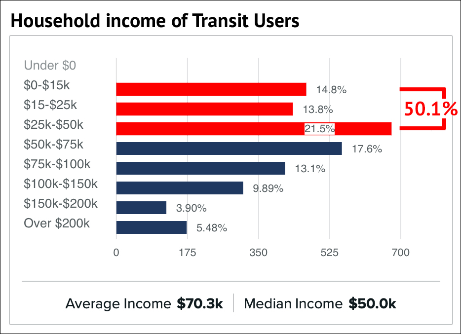This also isn’t the first time the MTA has taken to using the press to ask the mayor to take bus priority seriously. In 2023, then-New York City Transit President Rich Davey begged the mayor to “stay with us” and finish the proposed Fordham Road offset bus lane. Adams’s response was to walk away from Fordham Road bus riders just two months later, a decision that’s still hurting bus riders in that part of the Bronx, a majority of whom earn less than $50,000 per year, according to data from Replica. (See charts below.)