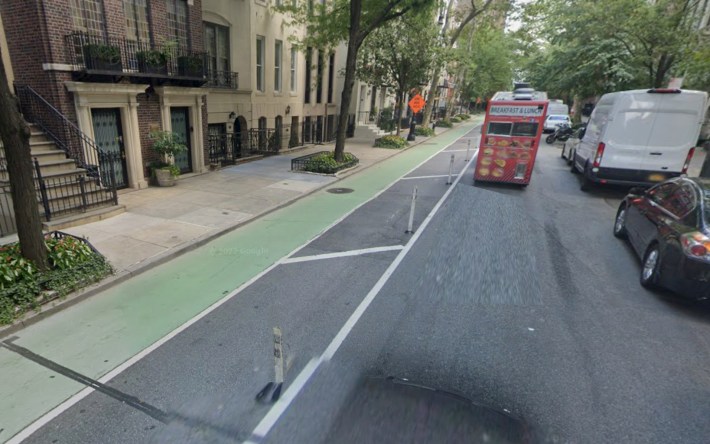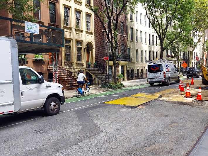 Because of metal plates covering the roadway cuts after-hours between Third and Second avenues, drivers don’t bother slowing down, but merely veer into the bike lane, which used to have flex-posts to at least suggest to drivers that the green-painted lane is not theirs.