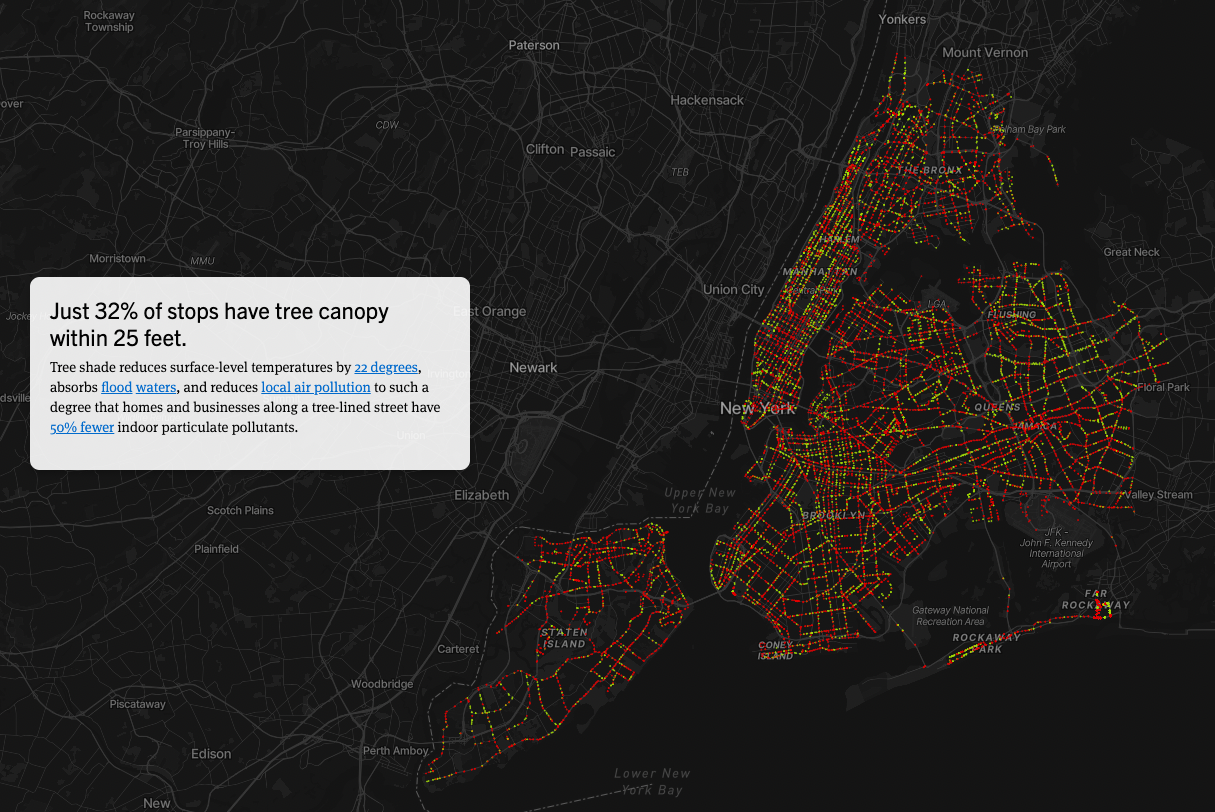 For the study, Transportation Alternatives identified the 400 hottest and coolest bus stops in the city and found that people living near the hottest stops were more likely to commute by bus, were 40 percent less likely to be white and were 62 percent more likely to live below the federal poverty line.