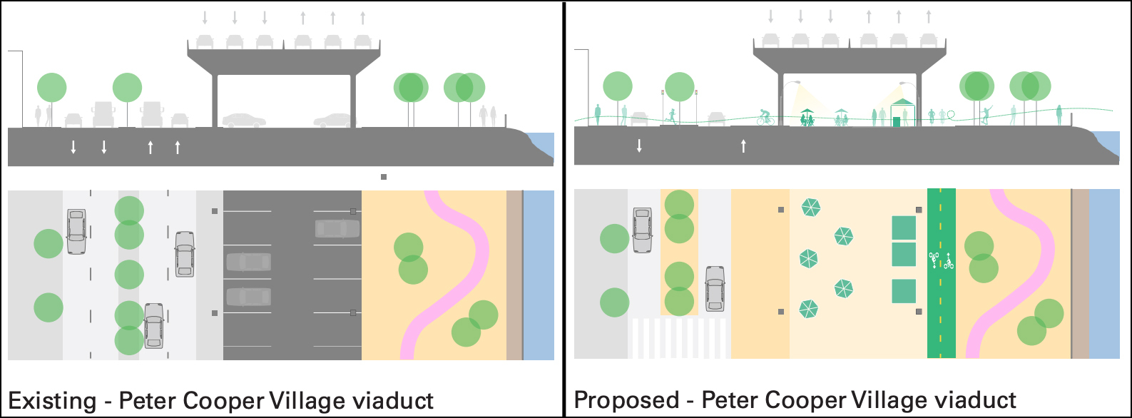 The WXY study compared the FDR to the Bentway, a sprawling repurposed public space underneath the Gardiner Expressway in Toronto, Canada.