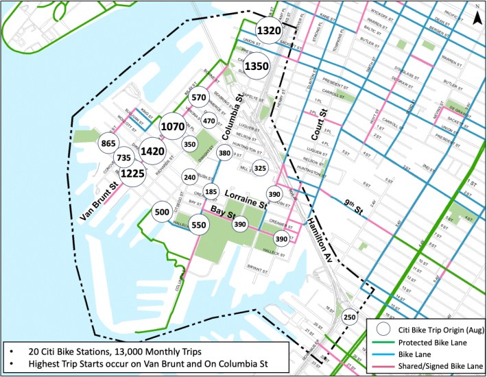 The neighborhood’s 20 stations log some 13,000 trips a month, with hotspots on Van Brunt and Columbia streets, according to a recent DOT analysis of the neighborhood. The area also has an above-average rate of people who bike and walk to work, at 27 percent — nearly three times the city average of 11 percent, according to the Census.