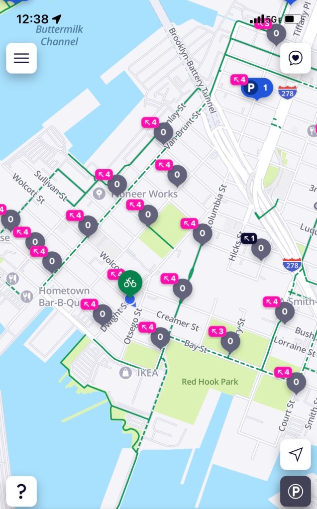 Bike share riders are often forced to circle the neighborhood or beyond for 20 minutes to find an open dock, racking up more charges and often ending their trips far from their destination. And even if one dock is free, many people head to Red Hook in groups, noted one local game designer.