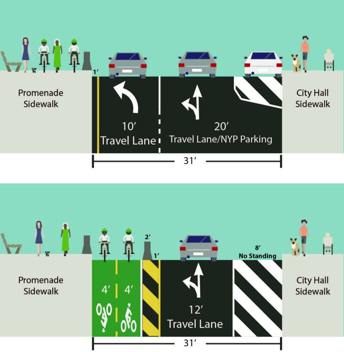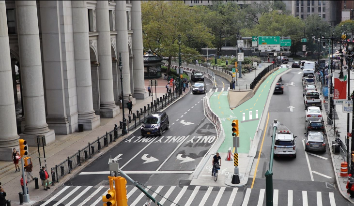 The new scheme would take the existing left-turn-only lane for car drivers to access the Brooklyn Bridge from Centre Street and refashion it into a protected two-way bike lane, giving cyclists a way to get off the bridge and head downtown without having to mix with pedestrians or cars.