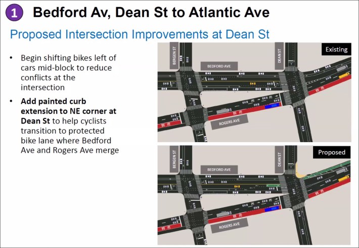 Bedford Avenue transitions from a road with northbound and southbound traffic at Dean Street, where the road intersects with northbound-only Rogers Avenue. To guide cyclists through the transition, DOT plans to paint a mid-block green lane one block south at Bergen Street.