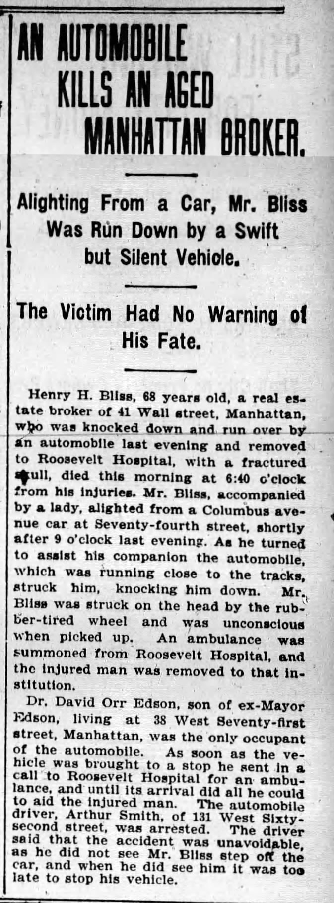 Of course, none of that had to happen. When Bliss — a prominent real estate man and grandson of a Vermont governor — was killed, automobiles were still a plaything of the rich, with just 2,500 cars manufactured in the United States that year.