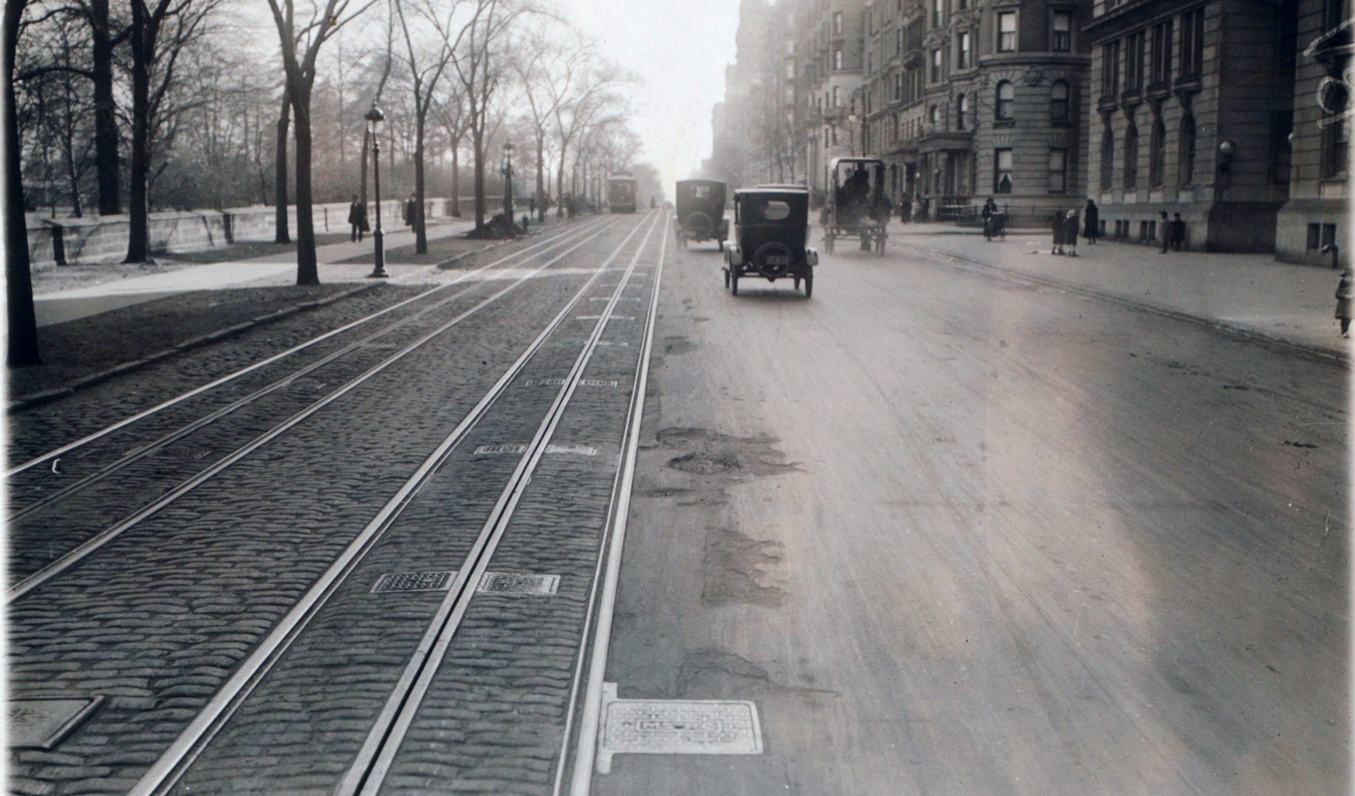 Of course, Bliss’s death — which made newspapers from coast to coast — had nothing to do with “jaywalking,” but with basic road design. Before automobiles, the stretch of Central Park West was mostly traversed by trolleys and people using horses for locomotion, but that changed in the early part of the 20th century, as this historic shot shows: