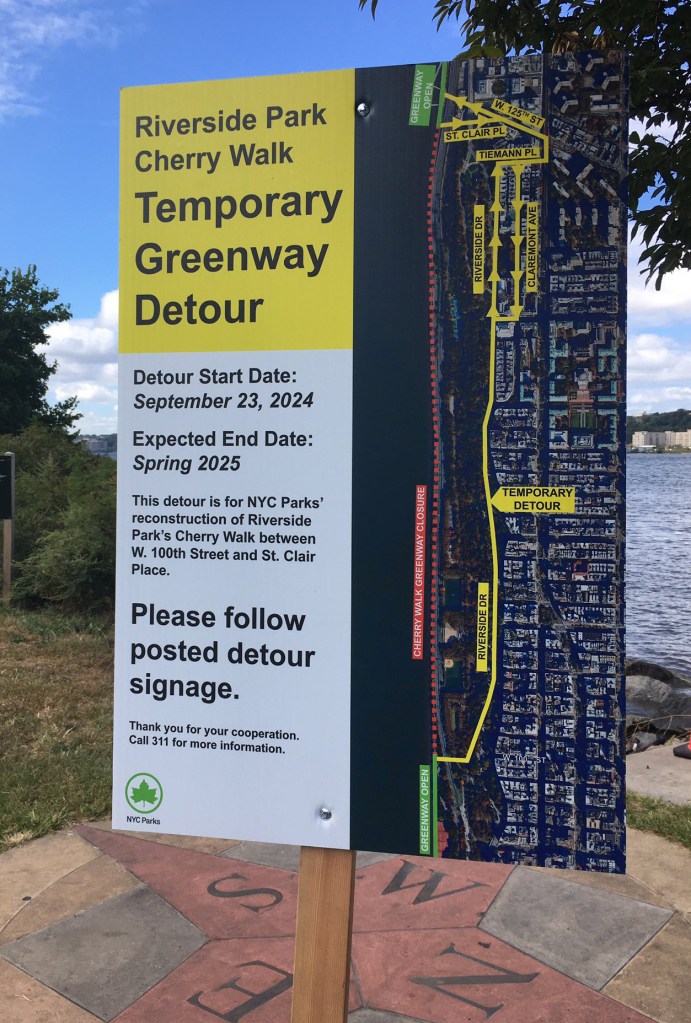 The agency will shutter the popular Hudson River Greenway between W. 100th and W. 125th streets through March to repair a section of the bike and pedestrian trail known as the Cherry Walk — just weeks after shutting down another part further uptown in Washington Heights due to a returning sinkhole.