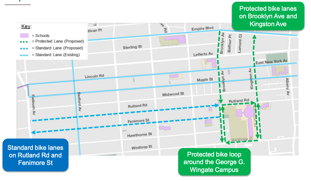 The sections of Brooklyn and Kingston avenues along the George Wingate school’s campus, between Rutland Road and Winthrop Street, will be two-way bike paths, creating a safe way to cycle around the entire facility.