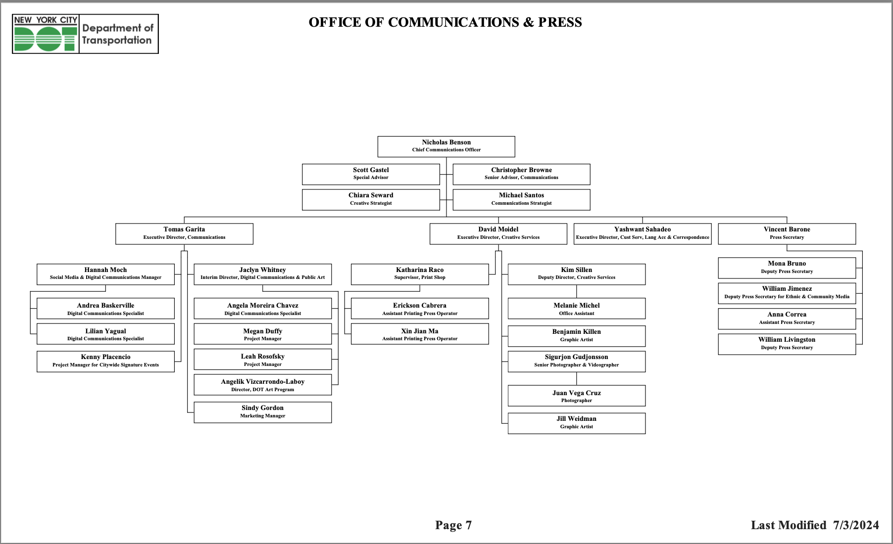 Update: Many months after initial publication of this story, Benson wrote Streetsblog contending that our numbers appear inflated because one of the org charts we reviewed did not “go as far down the organizational hierarchy as the newer one.” For instance, the older one, Benson said, didn’t show a variety of staffers, such as social media team members, graphic designers, print shop staff, a website person, a marketing person, and a photographer/videographer.