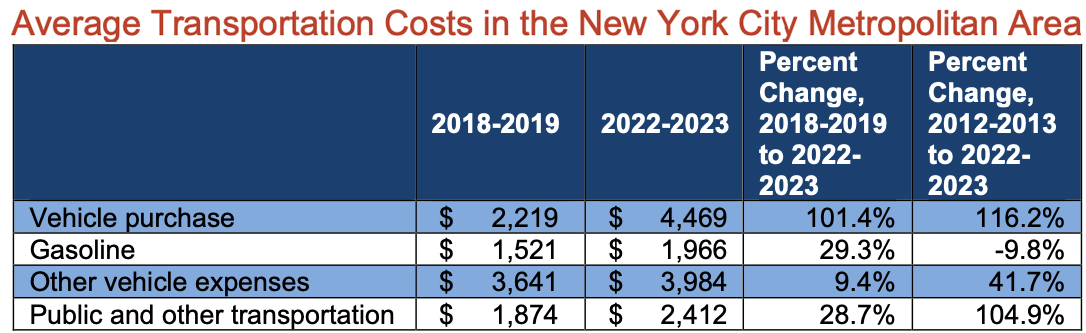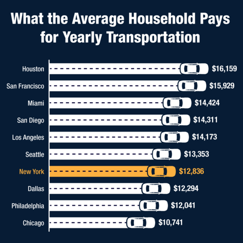 The good news is that in 2023, 48 percent of New York City households relied on public transportation for work, compared to less than 4 percent nationally. That single fact reduces the share of a typical New York City household budget spent on transportation compared to other cities because nationally, 93 percent of the average household’s spending on transportation is car-related, according to the American Public Transportation Association.