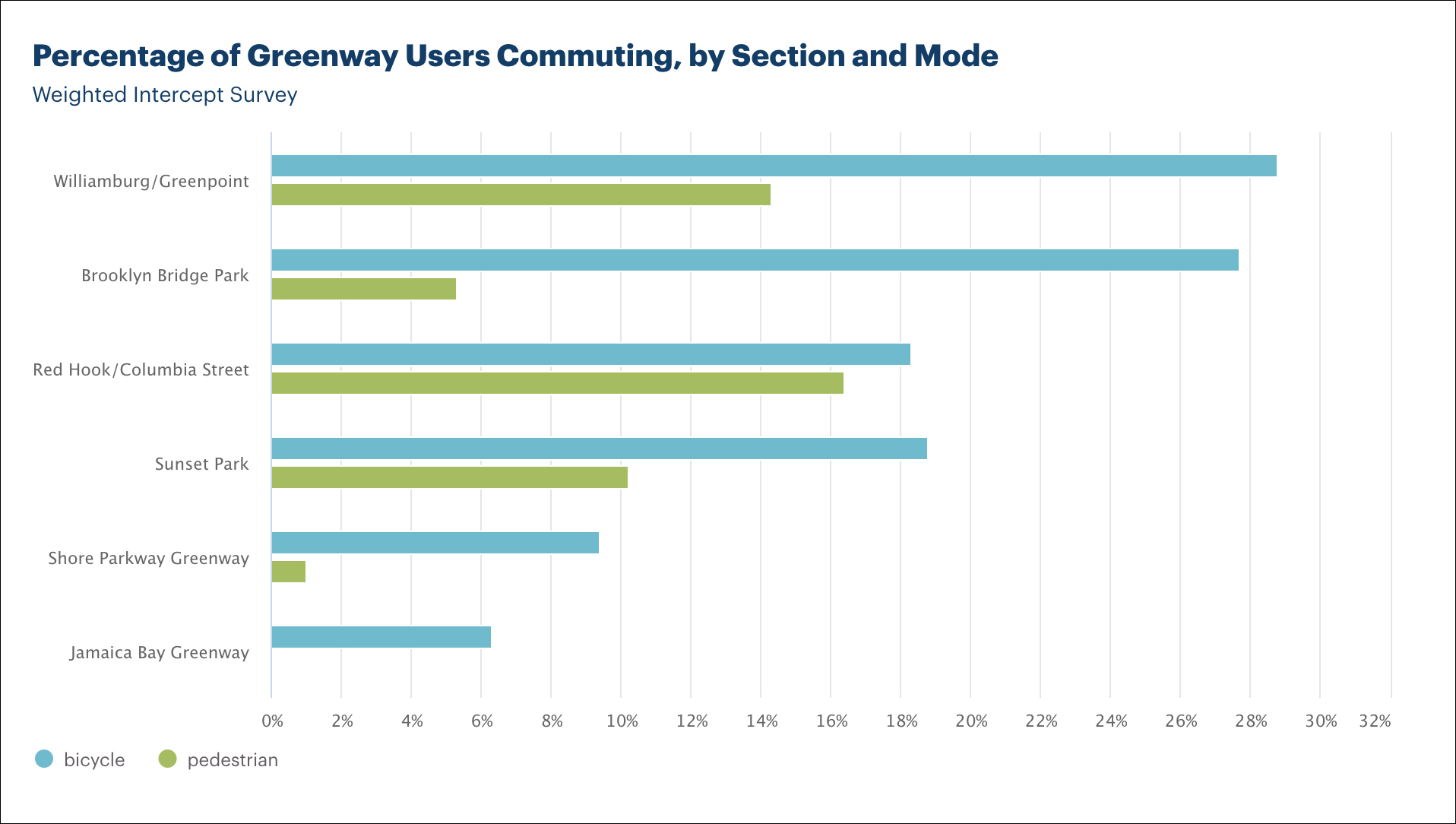 Nearly one-quarter of bike trips and one-in-eight pedestrian journeys on the borough’s coastal greenways were for getting to or from work, according to the study by the Brooklyn Greenway Initiative, Regional Plan Association, the Department of Transportation and data collection company Numina.