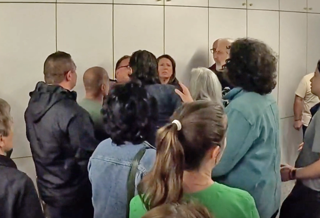 “I want everybody who is not interested in this — because it’s not a public hearing, because it’s divide and conquer — to leave now,” Paladino ended her rallying cry. As the group swarmed towards the exit, DOT staff attempted to calm the group down — but not before Eric Forte, Paladino’s budget director and office manager, nearly got in an altercation with an attendee. DOT’s Vince Barone, in the teal shirt, had to physically hold Forte back from the man.