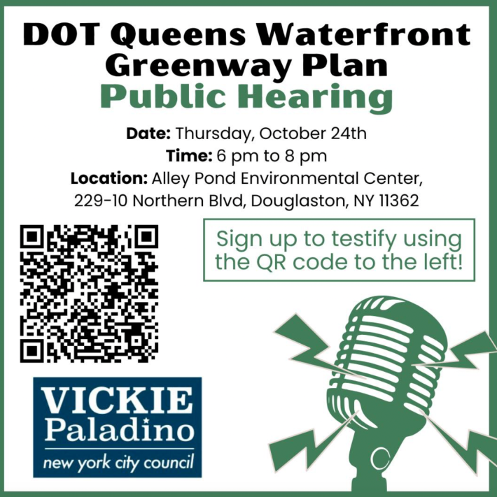 That’s how Council Member Vickie Paladino (R-Whitestone) ended her introduction at last Thursday’s Department of Transportation workshop convened to solicit community feedback on possible improvements to the Queens Waterfront Greenway. “There’s no reason for anybody to jump out of their chairs and get excited,” she continued. “So please, be courteous and kind to whoever you’re speaking to tonight.”