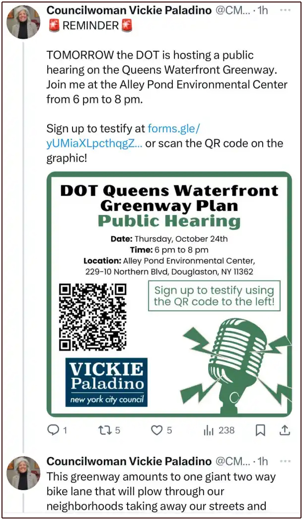 She even provided a QR code for people to sign up “to testify,” but the link went to the DOT attendance form — a form that specifically said this meeting was about community feedback on crafting a plan. The time for testifying, community board-style, is a future part of the lengthy DOT outreach procedure, which Paladino certainly knows.