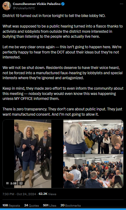 A neighbor of ours sitting right next to Paladino told her he lives in her district and bikes on these lanes every day. Dozens of other people shared similar perspectives, prompting one person at the meeting put it, “What she was really saying was that no one who matters uses the bike lanes.”