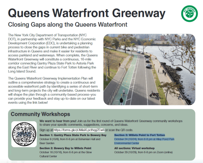 On Oct. 24, the Department of Transportation hosted a workshop on a potential Northern Queens Greenway. Like the two previous workshops (and the hundreds of DOT workshops for other projects), there was a short introduction and facilitators led small groups to gather comments on maps. But unlike other DOT workshops, this one was marred by Council Member Paladino, who initially misled her supporters into thinking this would be a public hearing, akin to a community board meeting, rather than the kind of feedback sessions DOT does all the time.