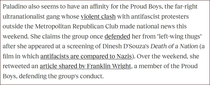 - According to Democrat Tony Avella (Paladino’s political rival), Thomas Paladino was a member of the Proud Boys (a violent group that stormed the capital on Jan. 6) and that Paladino has posed with pictures of its members. An article from Gothamist suggests Vickie Paladino may have more direct ties:
