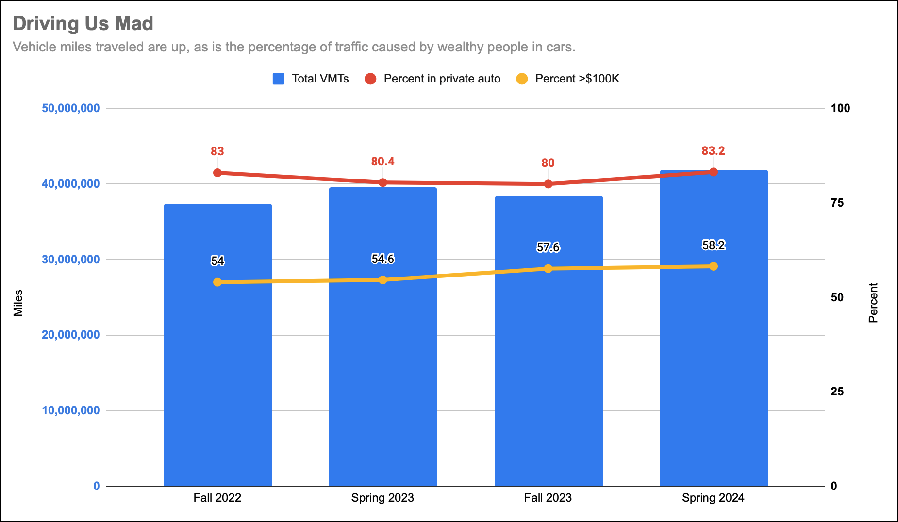And the portion of the traffic caused by car drivers is getting richer. Drivers with household incomes above $100,000 are up from 54 percent of the VMTs to 58.2 percent of the VMTs — an increase of nearly 8 percent.