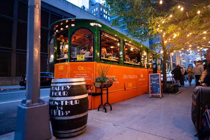 The wine and chocolate bar Ayza in Midtown has served customers in a retro trolley since the pandemic began more than four years ago — and it has not moved since. City officials recently also warned the owners they would have to remove it.
