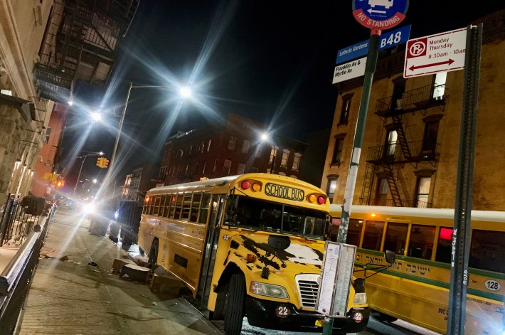 Forced by the city to return the space formally occupied by curbside dining to private car owners, a resourceful Brooklyn slice shop has parked a school bus in the so-called parking lane and is inviting diners to eat inside.