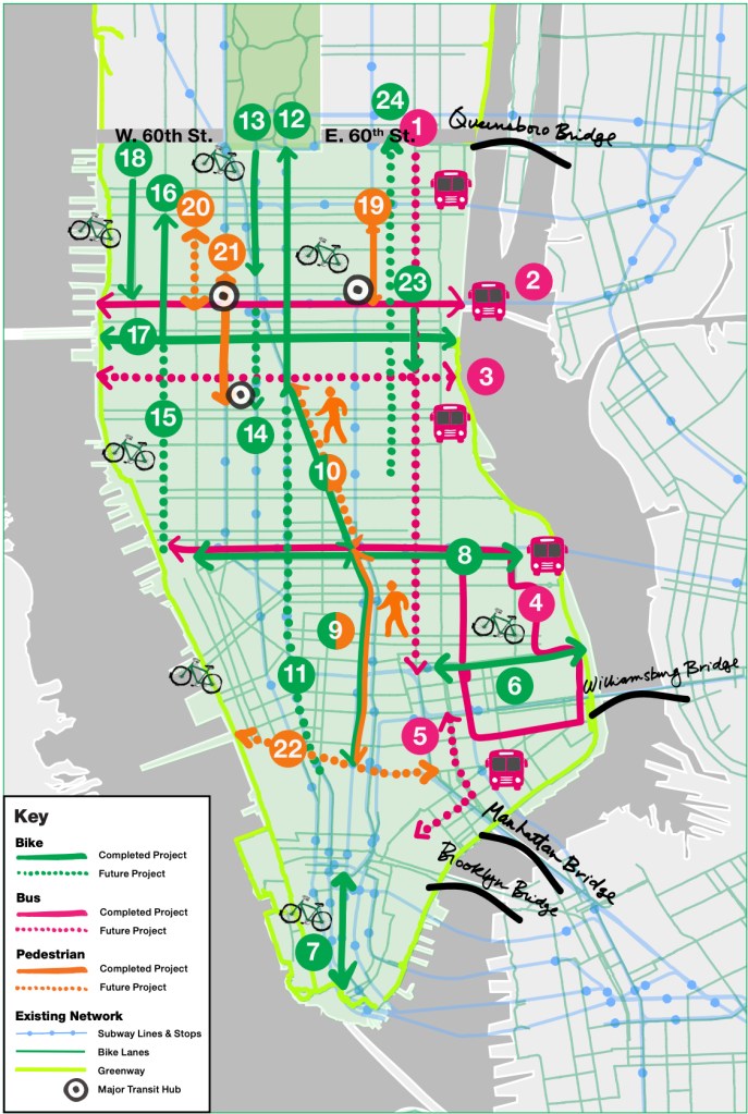 DOT rolled out some important bike lanes in recent years that it also included in the report, such as the Brooklyn Bridge path and McGuinness Boulevard, but there are still plenty of to-dos in and around the congestion zone.