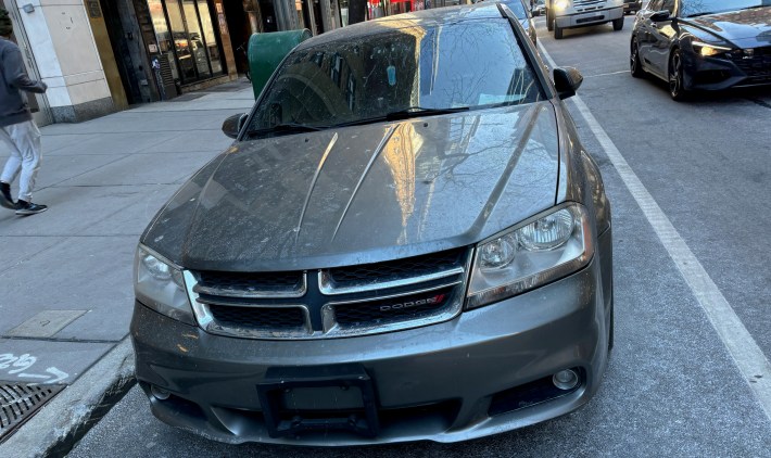 A friend sent us another example of this, a car that had just passed under the congestion pricing gantries near Columbus Circle. The photo is at the top of this post. Here’s the front of the car — no plate or registration sticker: