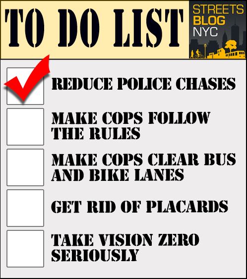 “Anything that reduces police chases is sure to make streets safer and less chaotic,” said Sara Lind, the co-executive director of Open Plans, the livable streets group that shares a parent company with Streetsblog. “What’s even more heartening is that this sends a clear message that the NYPD is taking their impact on the public realm seriously. It would be hugely beneficial if we could count that agency as an ally for people-centered streets.”