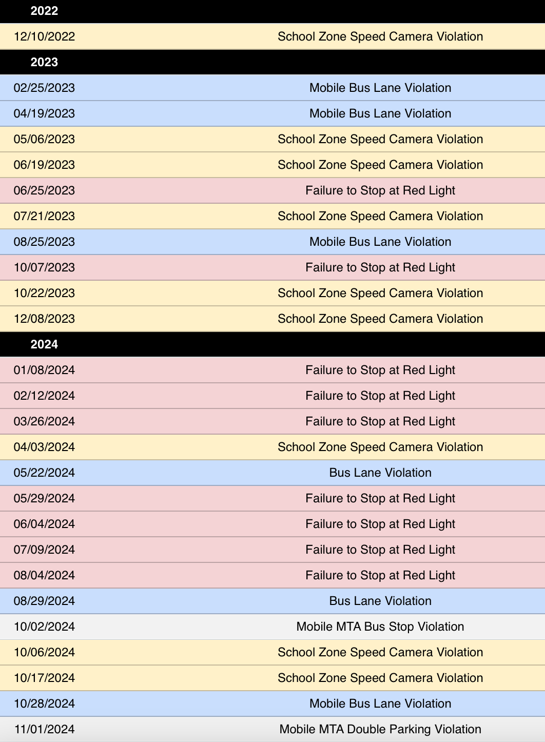 What we learned is that since late 2022, the car assigned to Gibson has been nabbed by city enforcement cameras 25 times — including nine times for driving 11 or more miles per hour above the speed limit, six times for parking in a bus lane and nine times for running a red light (which is more than the threshold that once could have subjected her driver to DOT-run a safety course … if the Council hadn’t let that program lapse).