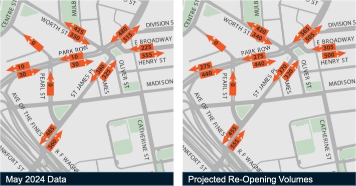 Traffic volumes on Park Row would become comparable to the hustle and bustle of 34th Street at Penn Station, according to the agency.