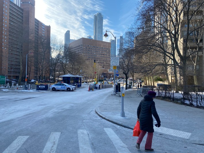 Park Row has for decades had security gates, allowing access only to only law enforcement, MTA buses, and residents. The area has devolved into a private campus for NYPD and the nearby courthouses to store their cars and other property, like protest barricades, angering residents who have to navigate around the law enforcement paraphernalia every day.