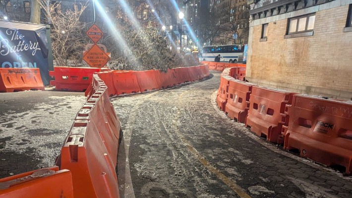 Riding around Lower Manhattan on Thursday, I saw other cyclists opting for the sidewalk next to bike lanes that looked like they may be frozen over. I saw snow pushed to the parking side of parking-protected bike lanes and melting into the path of cyclists, likely to turn into ice when the temperatures dropped again overnight. (That was the scene on Flatbush Avenue along Prospect Park, where one Redditor posted patches of ice in the strip’s crucial two-way protected lane.)