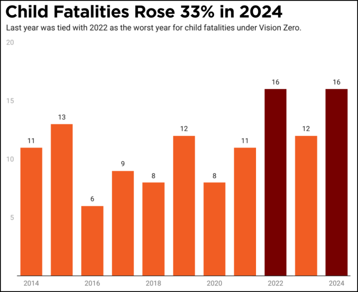 Last year’s bloodshed matched the previous record in 2022 and is up from 12 in 2023. The average number of children killed in crashes in the Vision Zero era has been 11, making last year’s bloodshed 45 percent above average.