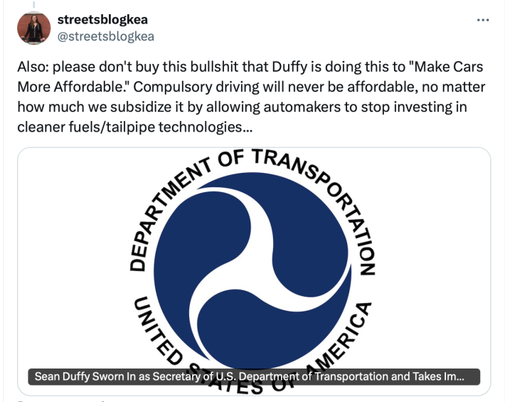 Of course, as Streetsblog USA Editor Kea Wilson pointed out on X, it’s not cars hitting Americans’ pocketbooks but car dependency. Many Americans have no choice but to drive, thanks to more than a century of short-sighted investments in highways and roads that make it impossible to get around any other way (a policy that Duffy will only bolster. “Cleaner” cars alone will do nothing to make transportation more cost-efficient.