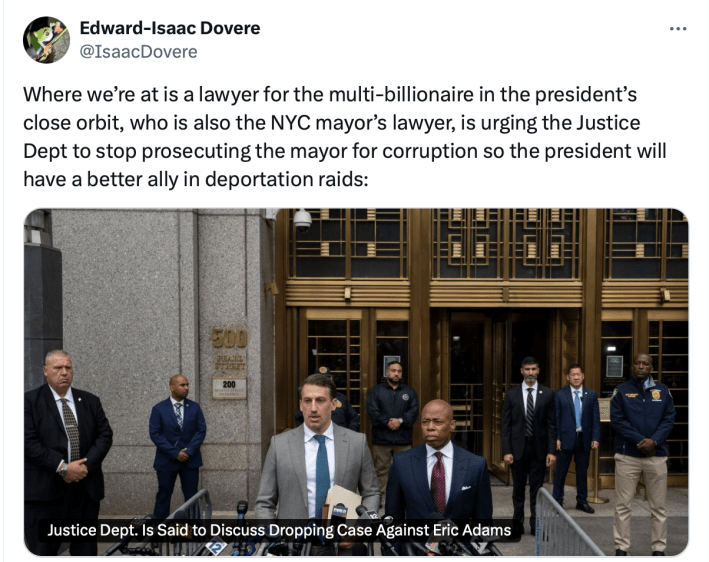 - Trump is reportedly discussing dropping the corruption charges against Mayor Adams, who plans to resume public events after several days in hiding with a mystery illness. Hizzoner’s lawyer, meanwhile, has denied that the mayor has any plans to resign — while suggesting to the Trump administration that Adams would go easy on them if the feds cut him loose. (NY Times, Daily News, NY Post, Politico)
