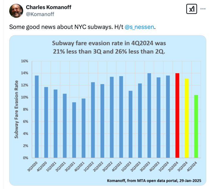 - Fare evasion is finally trending downwards, the MTA reported, Gothamist reported, which prompted Komanoff to tweet a colorful image: