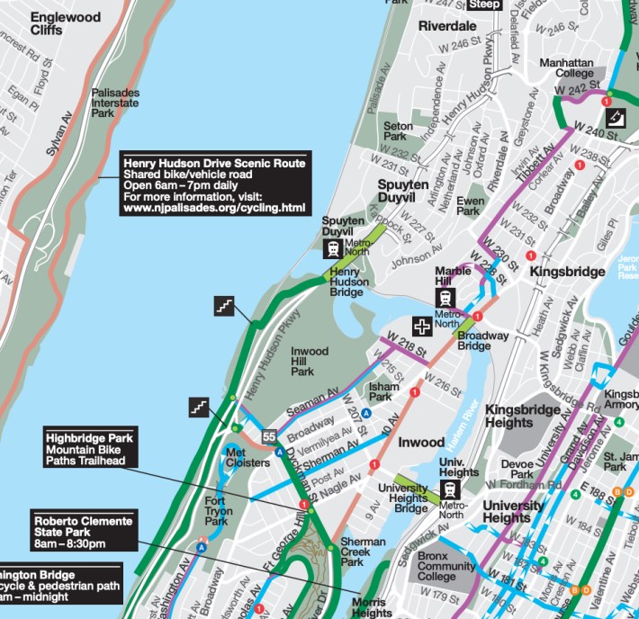 Starting on the Manhattan side, the nearby Hudson River Greenway just reopened late last year, between Dyckman Street and the George Washington Bridge, after the Parks Department patched a recurring sinkhole on the path, which runs along the Henry Hudson Parkway there.