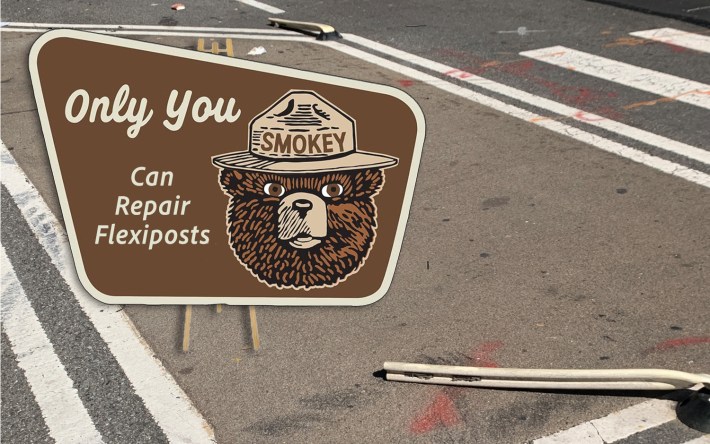 This last year, I developed a hobby of fixing these flexposts — or, rather, getting them fixed, since I don’t do it myself. Instead, I’ve filled out a DOT form well over 50 times at this point to report bollards either broken or missing in action. Because city agencies are typically reactive, not proactive; crews aren’t scouring the city for downed flexposts. But in a rare victory for municipal services, if you tell them, they will come.