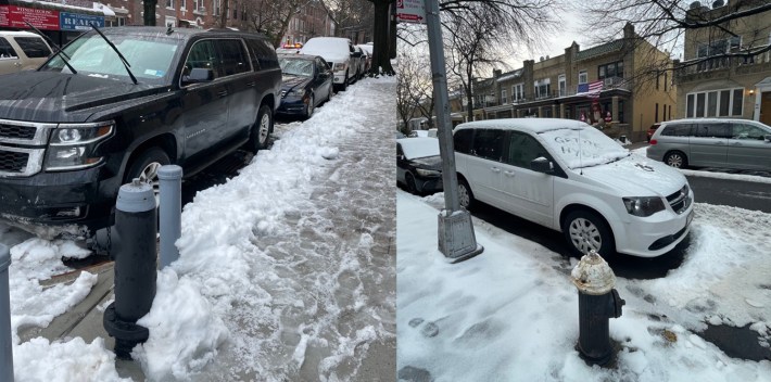 The FDNY shared photos of the illegally parked cars, but the plates are not visible. A representative for the agency told Streetsblog it does not have the license plate information.