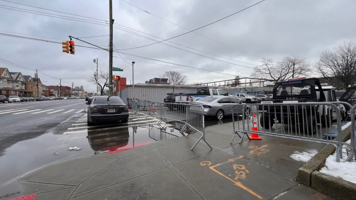 Gravesend Neck Road was completely blocked off on Thursday to serve as a private lot for police and officers’ personal cars. But after Streetsblog asked NYPD why it had barred normal traffic on the roadway, officers removed the barricades and restored traffic (albeit no parking) to the corridor.