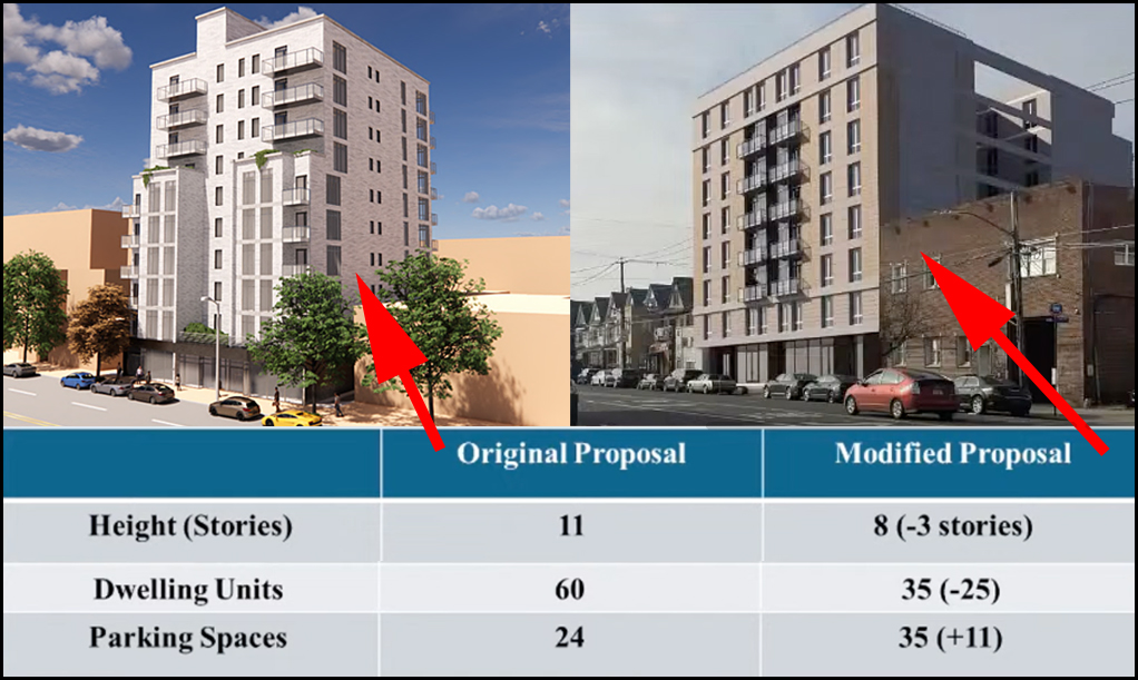 Originally pitched as an 11-story building with 60 dwelling units and 24 parking spaces (left in photo below), the project was amended to reduce the height and the number of units while also adding underground parking so that each of the 35 units had a space. But CB15 still rejected the rezoning (community board votes are only advisory) and tensions continued to rise over parking in the area.